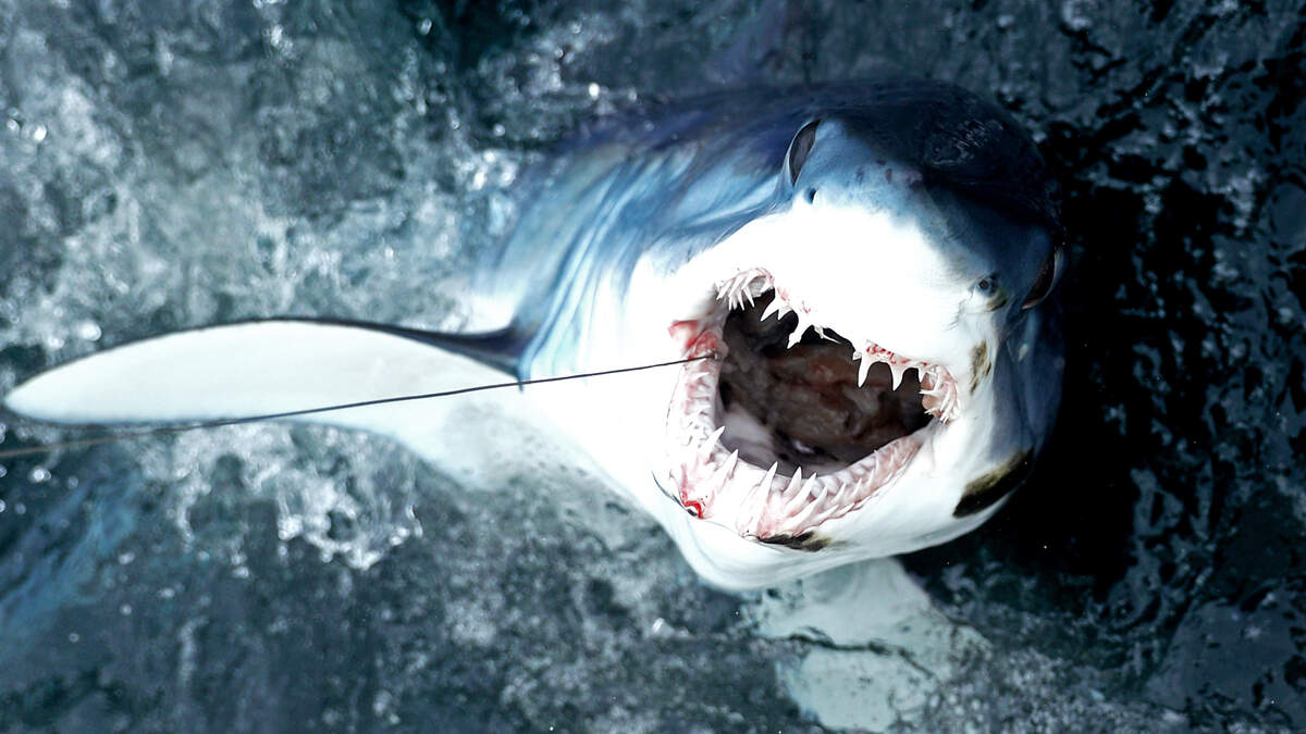 Ryan Churches of Churchys Charter NZ in New Zealand... said his crew and five customers were fishing for kingfish off the coast of Whitianga when a large mako shark took their bait, and thern landed on their boat.